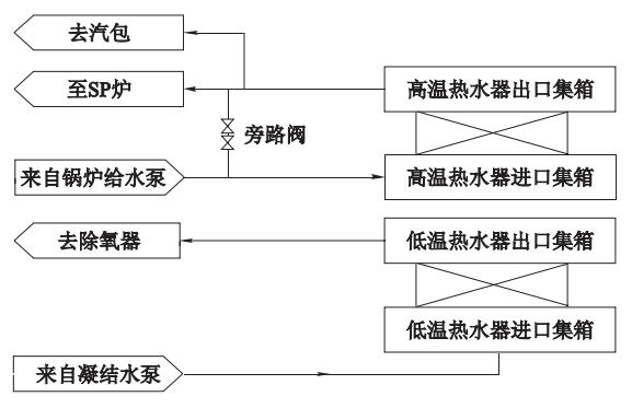 经现场仔细观察发现,机组中控画面与现场实际布置不符。中控显示来自锅炉给水泵的除氧水经AQC炉高温热水器加热后再分别输送到SP炉和AQC炉汽包(见图1)。而实际现场布置情况是经真空除氧器的锅炉给水,一部分进入AQC炉高温热水器,另一部分则通过旁路直接进入SP炉(见图2)。由于旁路阀开度大,多数锅炉给水直接进入了SP炉。由于进入AQC炉高温加热器的给水量少,吸收烟气热量少,烟气多余的热量传递到了低温热水器,致使进入低温热水器的凝结水被加热到超过设计温度甚至气化成饱和蒸汽或汽水混合物进而产生“气塞”,使低温热水器至真空除氧器之间的热水管道温度偏高致使管道热膨胀量过大,而管道系统又无法消解,故产生冲击振动。同时“气塞”的破裂又加剧了振动。同时也造成真空除氧器内温度高,真空除氧器排空蒸汽量增大,热量通过排空浪费了。